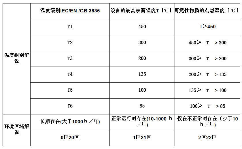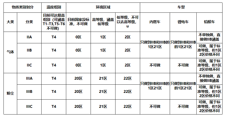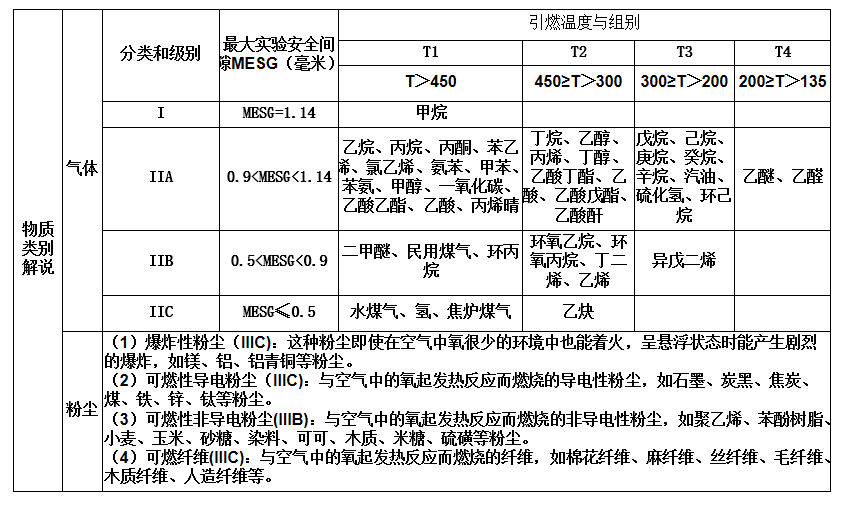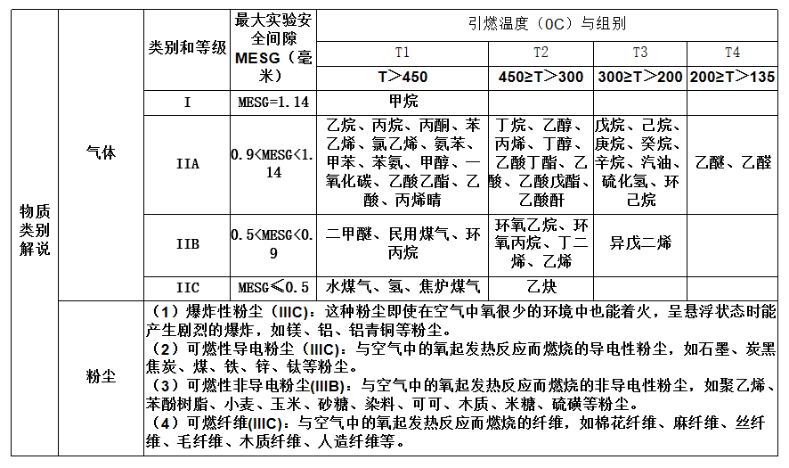 防爆等级是由物质类别,对应物质类别的温度组别,和环境区域组成的,防爆标准将爆炸性物质分为III类: